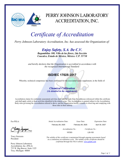 En nuestro laboratorio de calibración acreditado por Perry Johnson Laboratory Accreditation, Inc. (PJLA) bajo la norma ISO/IEC 17025, garantizamos la precisión y confiabilidad en la medición de gases.